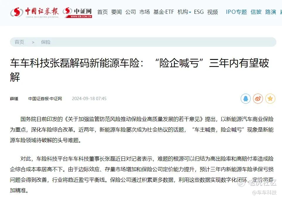 近日,车车科技CEO张磊接受《中国证券报》采访时表示,预计三年内新能源车险承保亏损问题会得到改善,行业将趋近盈亏平衡线。保险公司通过积累更多数据,利用这些数据实现数字化闭环,定价将更加精准。