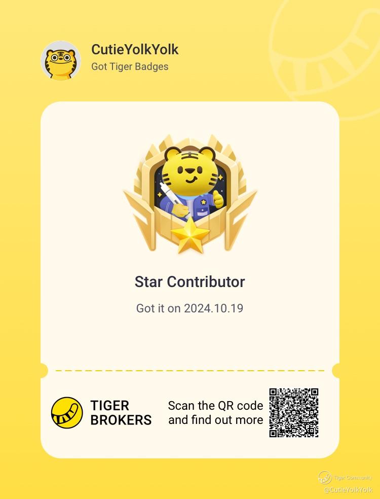 Thanks Tiger Brokers for recognizing my as a star contributor despite having relative short duration in this platform. I grow to like Trading here and will look to switch more trades over here progressively. Huat ah everyone!!