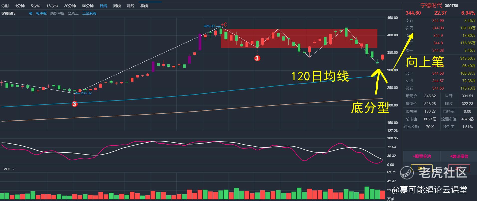 按照缠论级别划分,在A股日线已经属于中长线了。因此,对于在日线出现缠论海底捞月指标信号的大盘股股票,需要注意。同样还有一个信号需要注意,也就是郭老师周末看盘所讲的,120日均线,即半年线。120日均线属于中长线的均线,当股价会跌到它附近时,都会获得支撑。简而言之,都要有一个反弹确认。