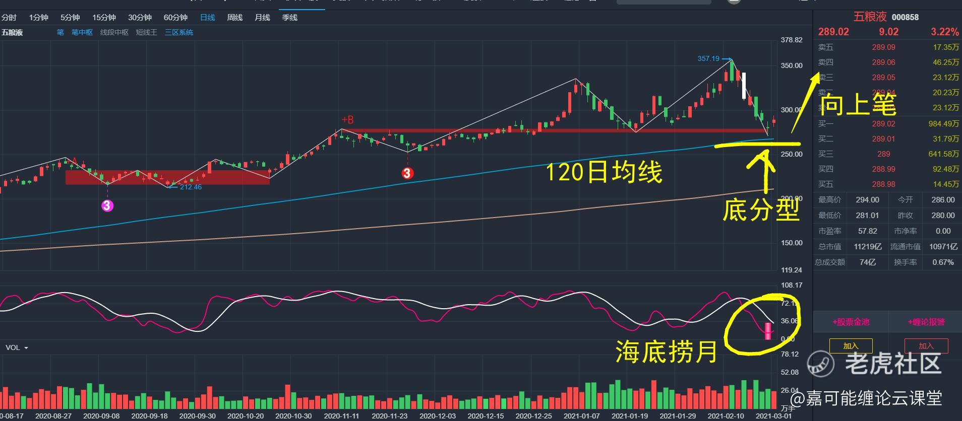 更为夸张的是,五粮液(000858)在日线出现了海底捞月。海底捞月作为专门抄底的指标系统。有几个特点。