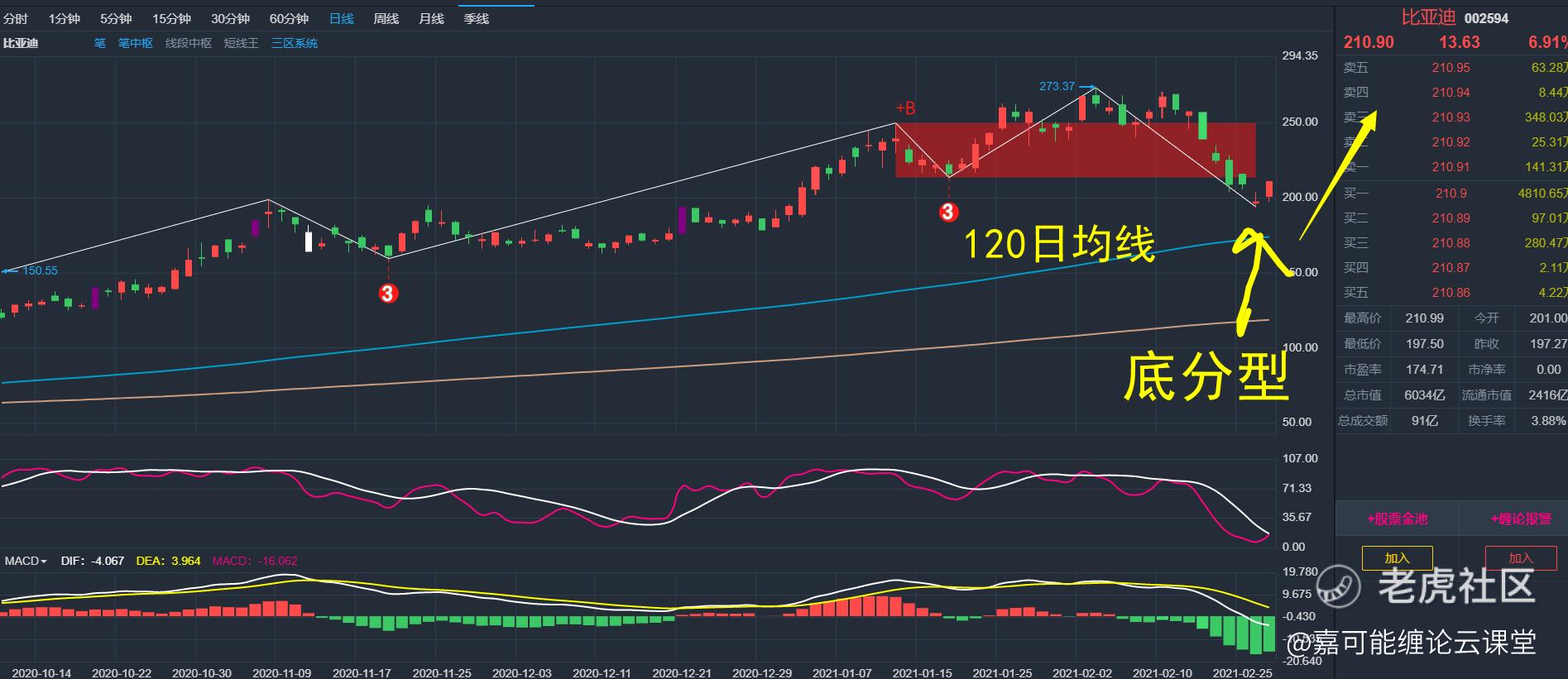 标准的缠论底分型,并且离120日均线及近。这里的底分型出现,意味着接下来比亚迪(002594)在日线将走一个缠论向上笔。