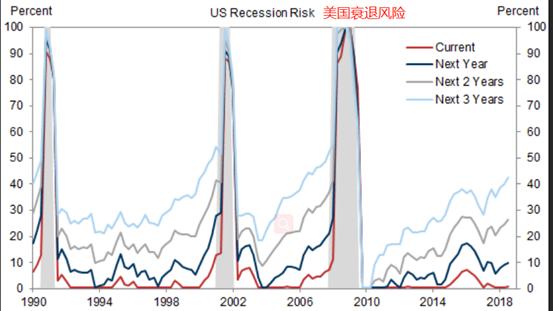 这是因为经济衰退的历史原因——经济过热或金融不平衡——目前都没有出现问题。因此,我们的衰退模型仍然表明,明年经济下滑的可能性相当低,仅在2-3年内达到历史平均水平。