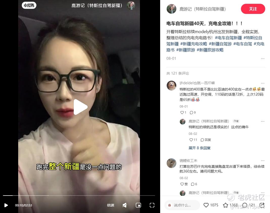 旅行博主小姐姐@鹿游记(特斯拉自驾新疆) 全程实测,驾驶Model Y从杭州出发到新疆,历经40天13000多公里,并总结出充电路书:“特斯拉的续航很实在!这点的确牛。”