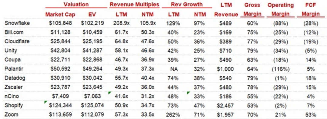 ZOOM NTM市场预计收入增速是71%(疫情还在持续,beat概率高),snowflake 104%,shopify 47%, 其他几家公司增速只有20%-40%。