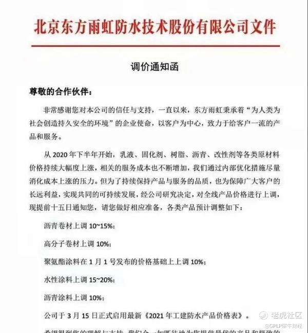 3月1日,有消息称,东方雨虹(002271.SZ)已于2月28日发布调价通知函,相关产品价格最低上调10%。