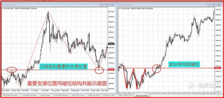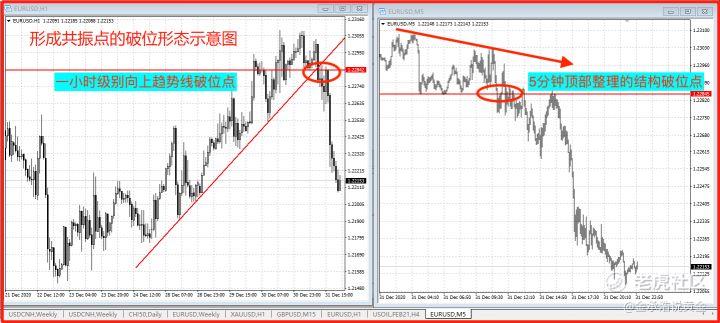 两个破位点形成共振,例如趋势线破位点,同时也是水平的破位点,例如趋势线 均线的支撑破位点等等,因为两个破位点共振,参与交易这个破位点的交易者会增加,订单量更会增加,因此这样的破位点成功的概率更高。
