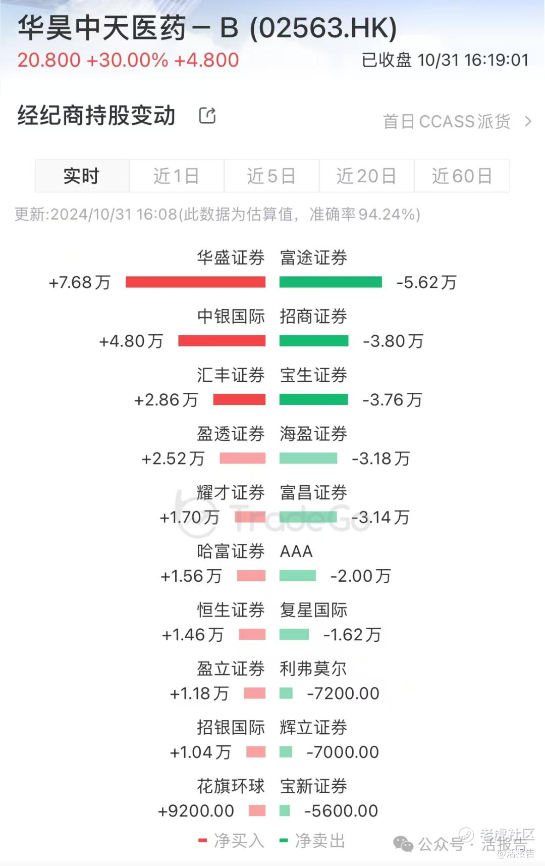 据LiveReport大数据,华昊中天上市首日净买入最多的是华盛证券、中银国际、汇丰证券,分别净买入7.68万股、4.80万股、2.86万股,净卖出最多是的富途证券、招商证券、宝生证券,分别净卖出5.62万股、3.80万股、3.76万股。