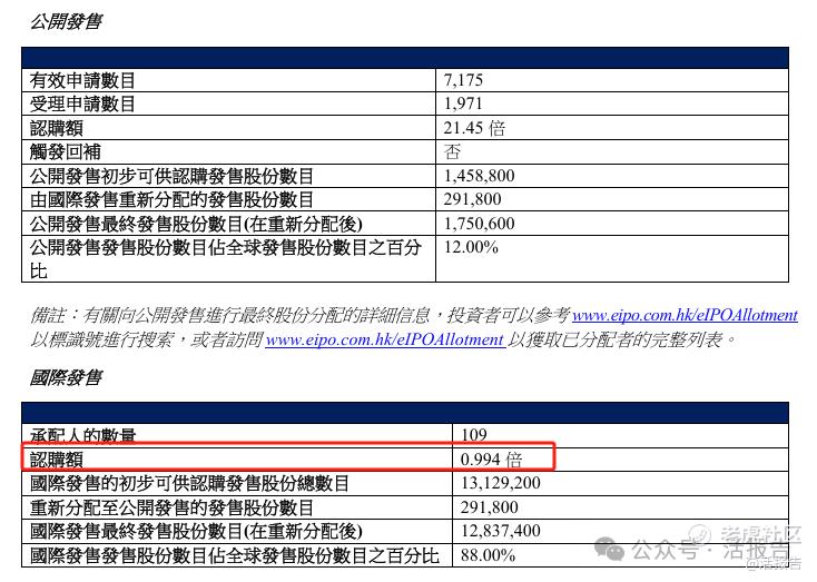配售结果显示,申请人数是7175人,公开认购倍数是21.45倍,一手中签率仅4.45%。通常而言,公开认购倍数超过15倍回拨比例应该为30%,但由于其国际配售认购倍数仅0.994倍,使得最终回拨比例仅为12%,被打新投资者称为“套路回拨”。