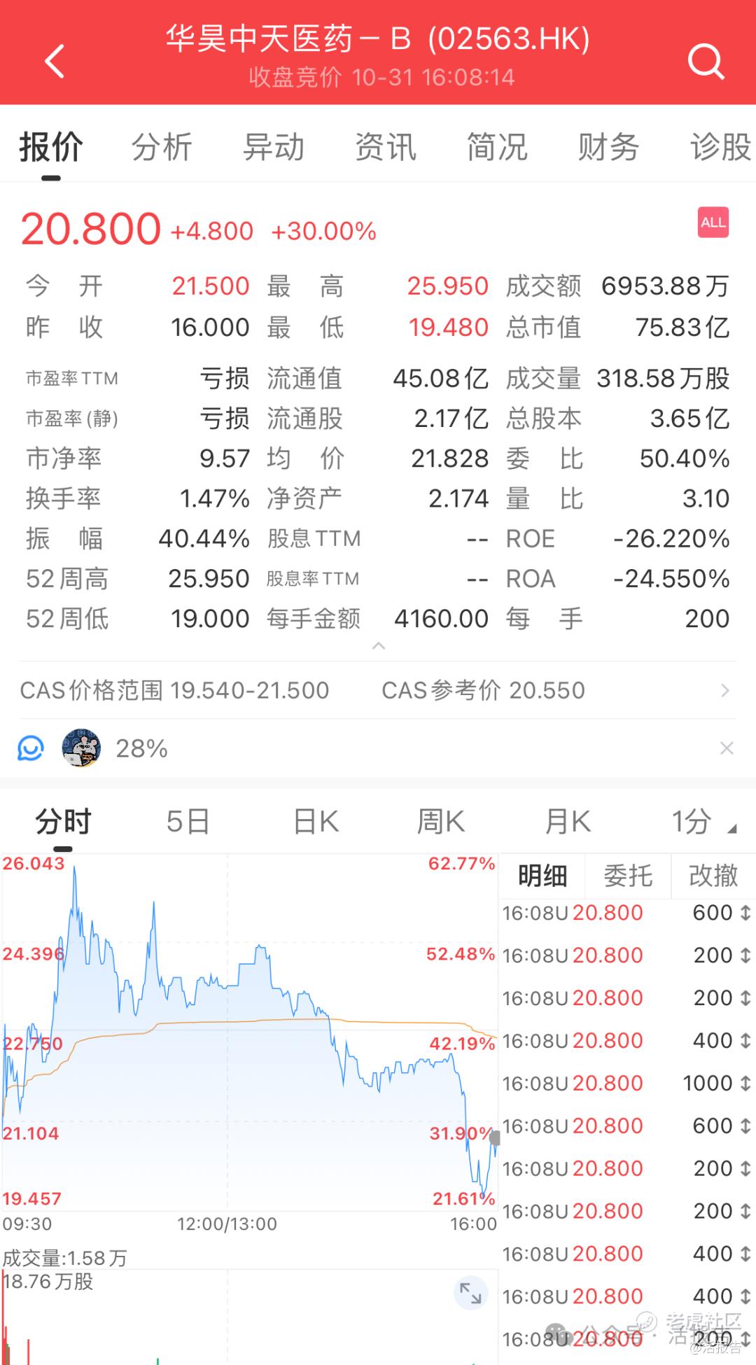上市首日,华昊中天早盘高开高走,高开超34%,然后一路高走,涨幅一度扩大超60%,股价接近26港元,午盘高位回落,涨幅收窄,尾盘跳水,涨幅收窄至30%,首日成交额6954万港元,最新总市值75.83亿。不计手续费,一手赚960港元。