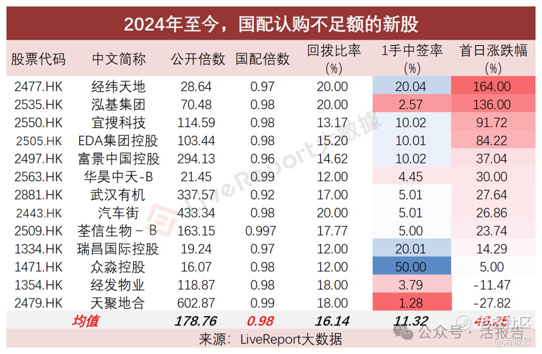 据LiveReport大数据,2024年至今,有13只新股虽然公开认购倍数超过15倍,但是国际配售却不足额,导致回拨比率降低。于上市首日,这13只新股的平均涨幅达到46.25%。