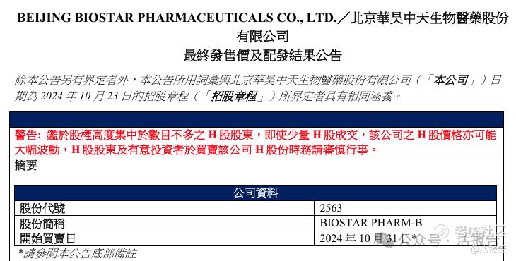 10月31日,华昊中天医药-B(2563.HK)正式在港交所上市,每股发售价下限定价16.00港元,发行1458.8万股H股。