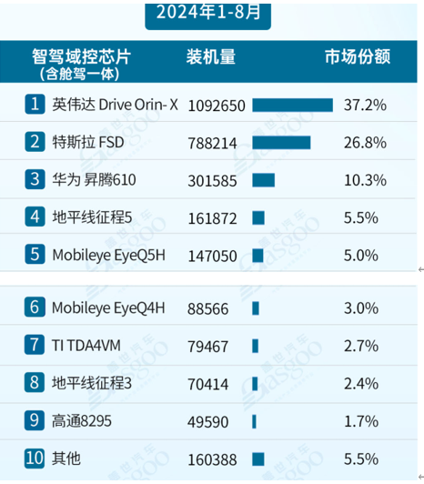 从盖世汽车的2024年1-8月中国智驾域控芯片装机量排行榜单,或许能更具象地看到地平线的市场地位。