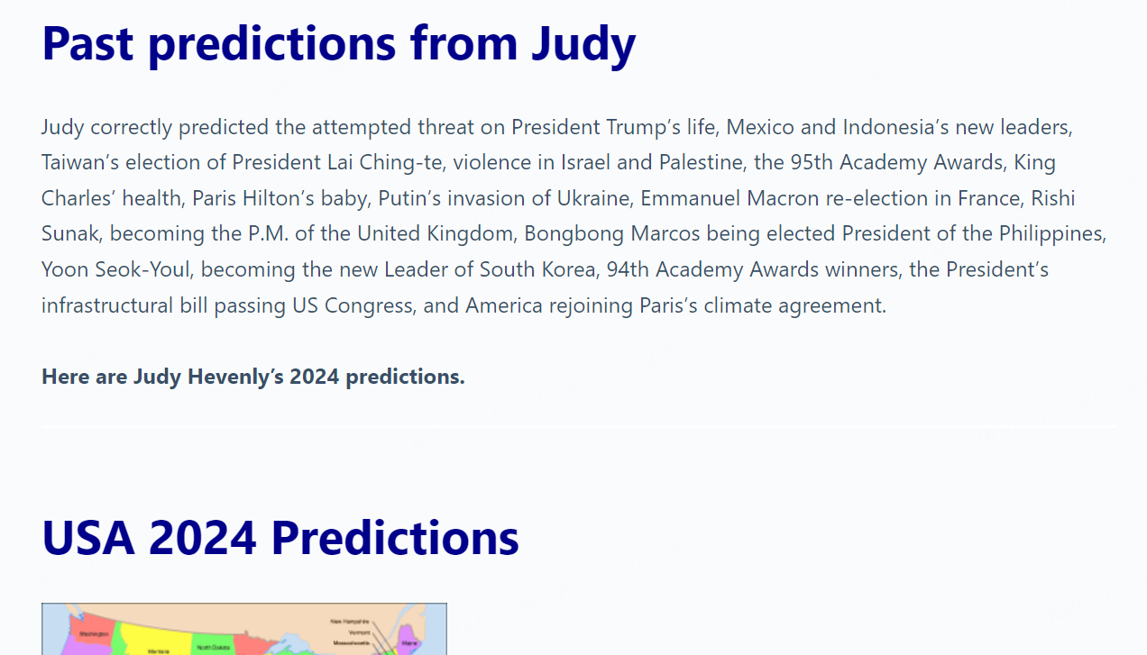 不到最后一刻,还真说不清楚会是什么结果,现在就是看玄学的最佳时刻~ 曾成功预言911事件、英国首相卸任、俄乌战争爆发、韩国领导人选举和英国女王去世的美国“通灵女巫”Judy Hevenly,23年年末,对2024年有关大选的预测,大概是:“两个白头翁,一陨一落空”。(但是没有找到这句话具体source,网络上可见的,说法都比较中庸)