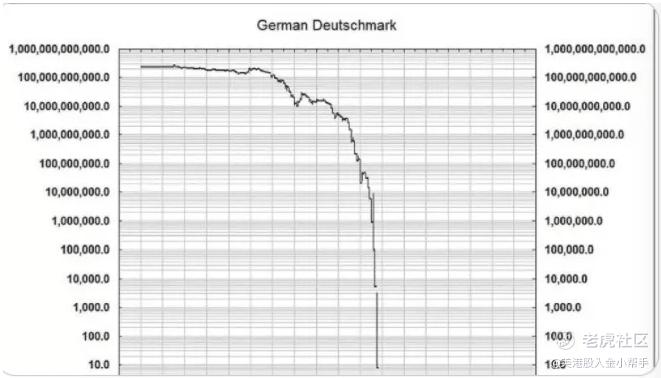 与此同时,华尔街的分析师则更为激进,他认为比特币没有顶部,原因是法币没有底部,随着法币购买力的持续下降,比特币价格则会水涨船高。他还给出了一张德国马克的购买力的曲线图。