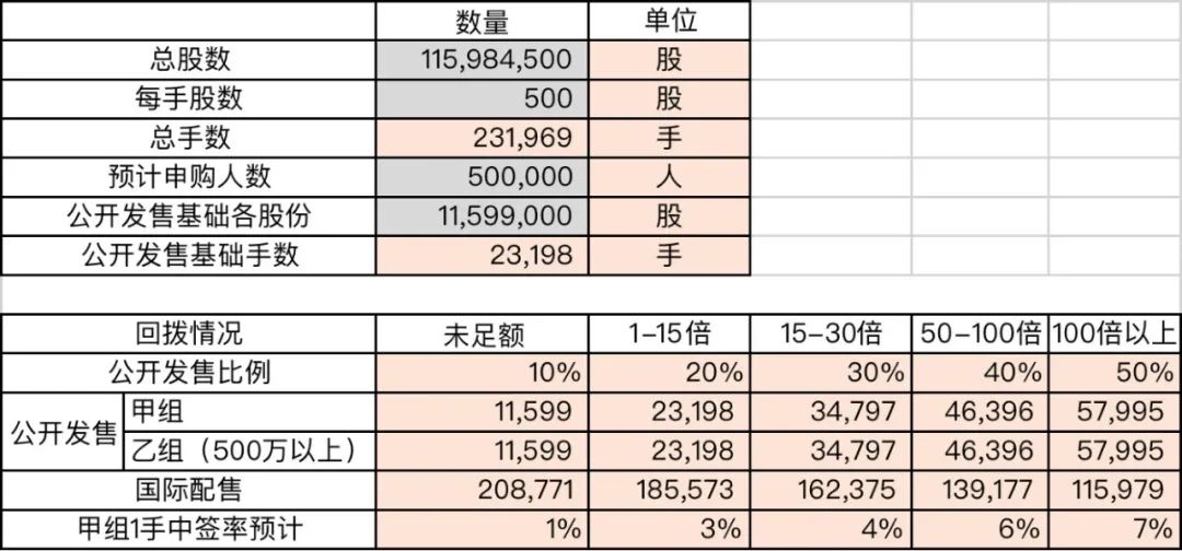 香港公开发售1159.9万股,每手500股,合计23198手,分配情况预计如下表。一手中签率预计5-10%。