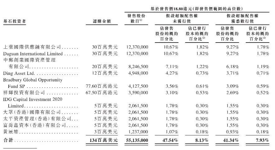 11家基石投资者,按照上限定价占比约47.54%,无知名机构的参与;