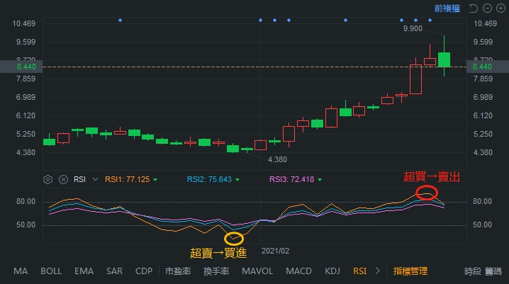 RSI>80,稱為“超買”,賣出
