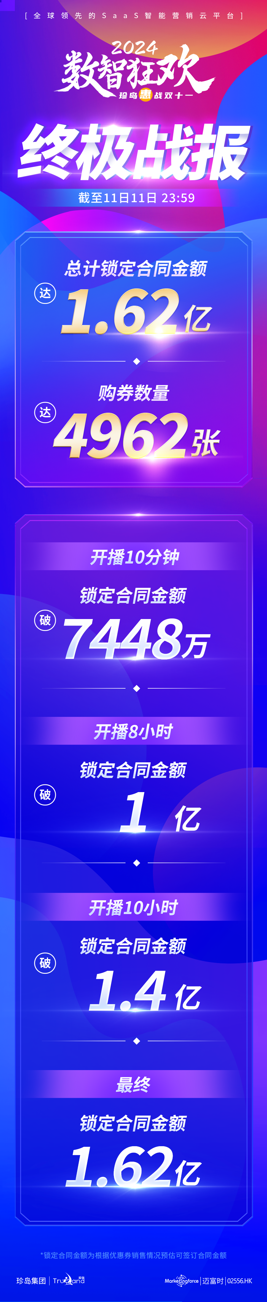 2024年11月11日晚24:00,【数智狂欢-迈富时惠战双十一】直播盛典圆满落下帷幕。本次直播共计锁定合同金额突破1.62亿,购券企业累计4962家。 战绩突破1.62亿元!再创历史新高,优惠活动仍在继续,错过再等一年,迈富时携手企业共赢数字智能新未来。$迈富时(02556)$
