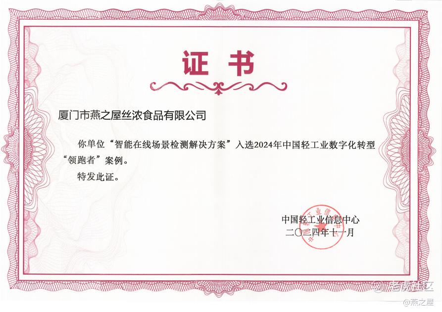 数字化转型是顺应国家战略和行业发展趋势的必然选择。燕之屋积极探索创新战略,开拓发展新路径,成果显著。此前,燕之屋智能在线场景检测项目获批“福建省智能制造优秀场景”,如今再获2024年中国轻工业数字化转型“领跑者”案例国家级认可和嘉奖,见证着燕之屋以卓越新质生产力领航数字发展的头部地位。未来,燕之屋将继续围绕数字化转型的核心布局,以智能场景为牵引,以科研技术为引擎,将数字化渗透到生产制造的各个环节,进一步探索数字创新技术与燕窝行业发展深度融合的新路径,推动轻工业高端化、智能化、绿色化发展,用科技工艺和智能装备为消费者提供一碗高品质好燕窝。