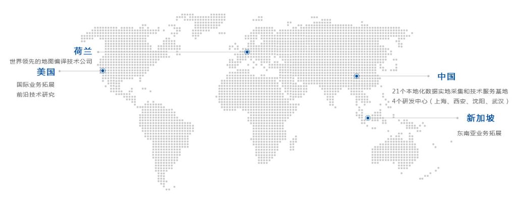 到目前为止,四维图新成员企业横跨全球,核心企业战略布局于4个国家,欧洲荷兰的世界领先地图编译技术公司、北美美国国际业务拓展前沿技术研究所、亚洲中国21个本地化数据实地采集和技术服务基地及4个研发中心(上海、西安、沈阳、武汉)。目前共有30个成员企业,旗下企业成员达到4700人。