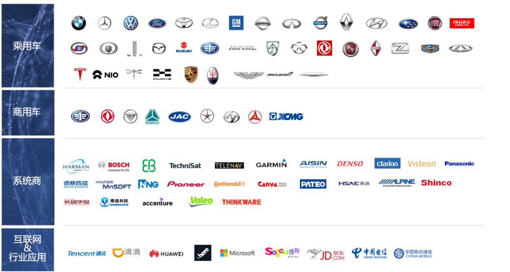 四维图新客户基本上遍布全球。客户群体覆盖扩展到四大类,分别为乘用车、商用车、系统商以及互联网行业应用。每个行业里面战略合作伙伴达到数十家,这些合作伙伴都布局于世界各地。其中合作伙伴主要有宝马、奔驰、大众、通用、沃尔沃、丰田、本田、雷克萨斯、福特、日产、英菲尼迪、宾利、保时捷、马自达、现代、起亚、标致、雪佛兰、斯柯达、悍马、Denso、Bosch、名爵、雪铁龙、别克、爱丽舍、一汽、北汽、上汽、荣威、吉利、奇瑞、长城、中华、海马……