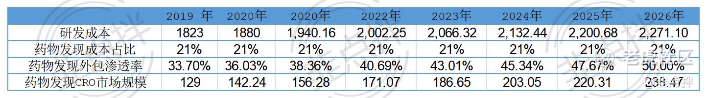 药物发现CRO市场规模=全球药物研发⽀出*药物发现成本占⽐*药物研发外包 渗透率