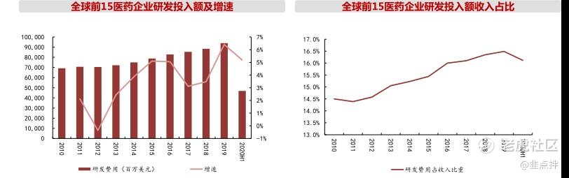2003年,新药研发总成本约为8.02亿美元,⽽⾄2016年,这⼀数据就达到了25.58亿美元,年复合增速为9.33%。因此,从全球前15的药企研发投⼊绝对值和研发费⽤率上来看,两者均在逐年上升。