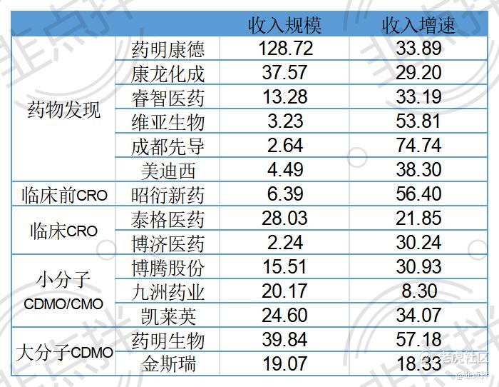 从收⼊规模上来看,药明康德明显⾼于同⾏业,且仍保持快速增⻓态势。除此之外,药明⽣物、康⻰化成的规模较⼤,其中,药明⽣物受益于近年来⼤分⼦药物市场规模的增⻓,增速较快。