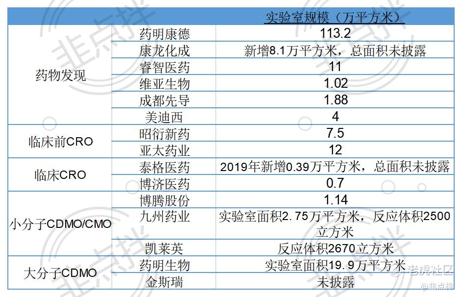 实验室规模——从实验室规模上来看,药物发现环节需要进⾏⼤量的筛选⼯作,因此,需要投⼊较多的实验室规模。⽽CDMO⾏业是产能导向,因此,在固定资产投⼊⽅⾯,也较⾼。相⽐之下,临床CRO属于轻资产运营,对实验室的规模要求不⾼。