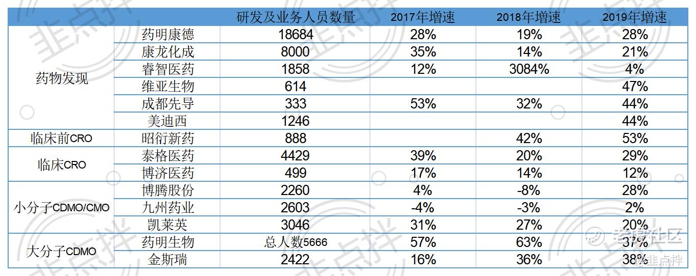 综合⼈员规模、增速来看,数据较⾼的是药明康德、康⻰化成、药明⽣物、泰格医药四家。