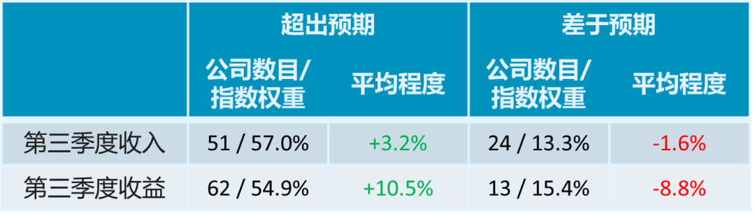 自十月初以来,纳斯达克100指数®中有75家公司(按权重计算占70%)公布了季度业绩。总体而言,这些公司本季度的收入和收益较预期分别平均超出1.6%和7.2%,其中45家公司(按权重计算占44%)更同时超出收入和收益预期。迄今为止,收入超出预期的公司比率(按指数成分股数量和权重计算)好于上一季度。尽管按指数权重计算的收益超出预期比率略有下降,但按成分股数量计算则略好于上季。