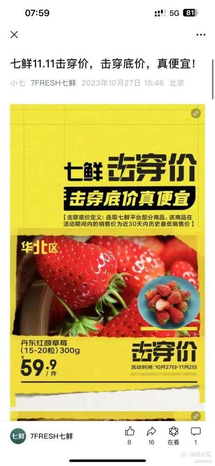 11月15日,京东七鲜在官方公众号又发布文章表示,其平台上的击穿价专区全面焕新,商品将比其他即时零售平台平均便宜10%,活动范围覆盖北京、天津、廊坊等华北地区。