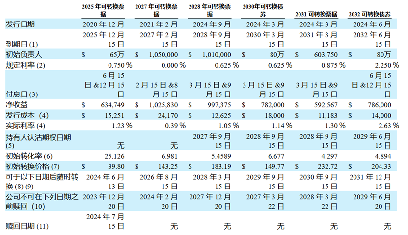 这些票据和债券到了特定时间,可以一定的比率转换成某一个价格的股票。比如,2020年12月发行的利息为0.750%的6.5亿美元票据于 2025 年到期, 从2024年6月13日起,持有人可以随时申请转股,每张票据可以转换为25.126股股票,转换价格为39.80美元(换成股票后等同于票据的1000美元)。