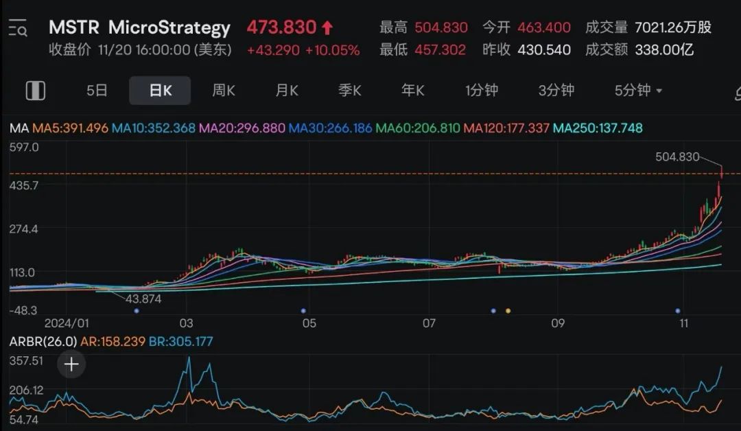 随着对加密货币示好的特朗普当选美国总统,MicroStrategy(以下简称MSTR)股价也涨疯了。从11月4日的220美元左右一路单边上涨,干到了11月21日的473.83美元。短短12个交易日,股价翻了1.15倍,市值突破1000亿美元。而跟今年初的最低43.87美元相比,MSTR股价更是涨了近10倍。