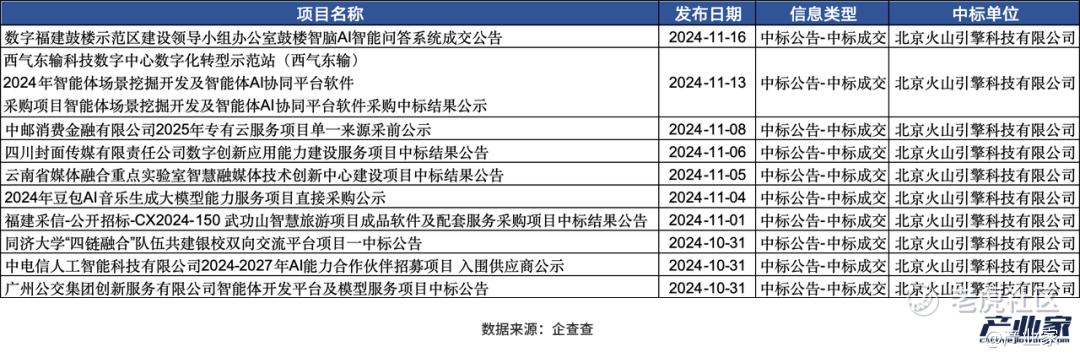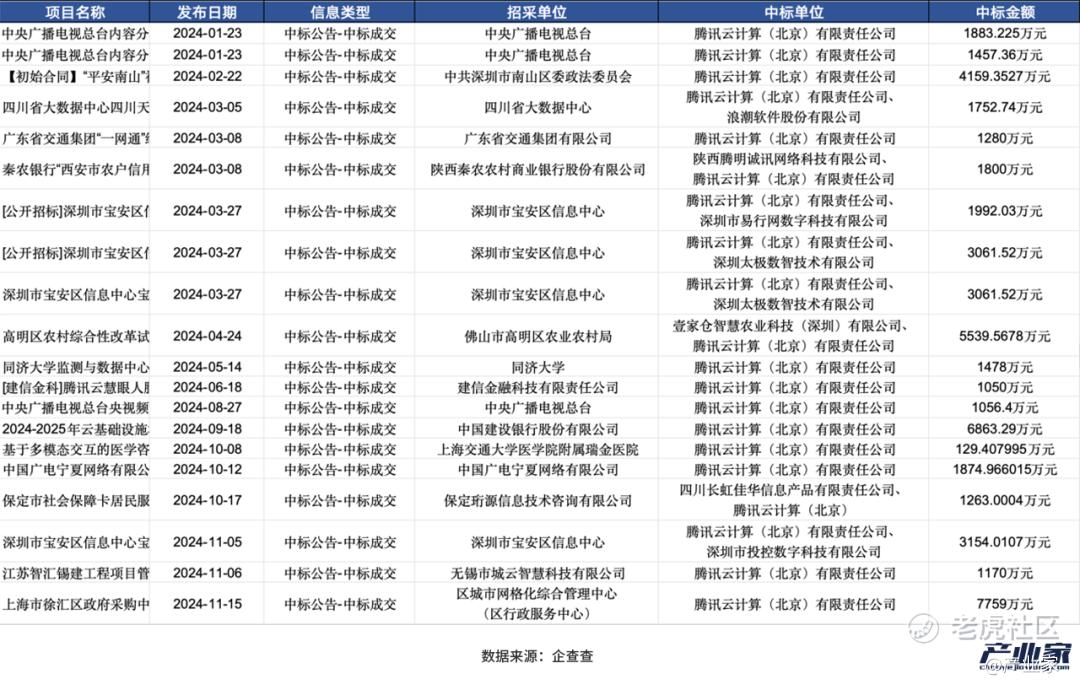 截止2024年11月19日,腾讯云超1000万中标成交项目有20个;百度网讯超1000万中标成交项目有8个;火山引擎超1000万中标成交项目有3个。