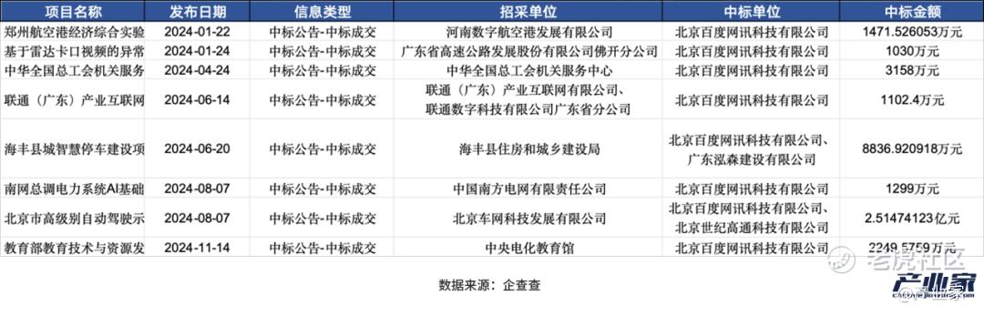 百度智能云的大单在央国企之外,也更体现在智慧交通领域和教育领域。其中在2024年中标成交的“北京市高级别自动驾驶示范区3.0扩区建设项目”,中标金额高达2.5亿元。目前,在企查查可查的信息中,是其今年中标金额最高的项目。