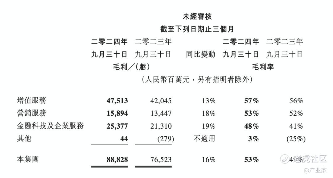 整体来看,腾讯的云业务收入还是较为平稳的。其中一个亮点在于,2024Q3腾讯ToB业务毛利同比增长19%至人民币254亿元,毛利率由去年同期的41%提升至48%,是其三大业务中,增长最快的业务。