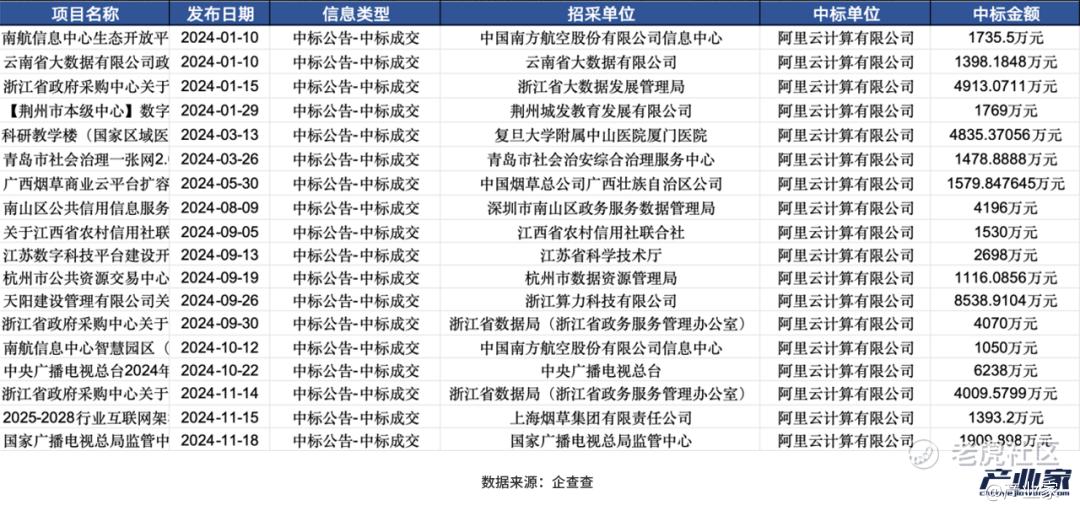 不过,仔细观察中标项目信息,可以发现每家云厂商的侧重点并不相同。例如阿里云的客户群更多是央国企,大单项目类型主要在数据、算力中心等建设、服务上。