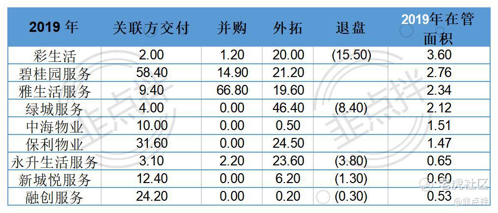 2.代表是否能通过市场化的形式获取项⽬,外拓项⽬⾯积越多,说明品牌力越强,对⽐可以发现,恒⼤物业、碧桂园服务、融创服务等来⾃于关联⽅在管⾯积占⽐较⾼,⽽绿城服务、永升⽣活服务第三⽅项⽬⾯积占⽐达到70%以上,意味着第三⽅拓展能力极强。