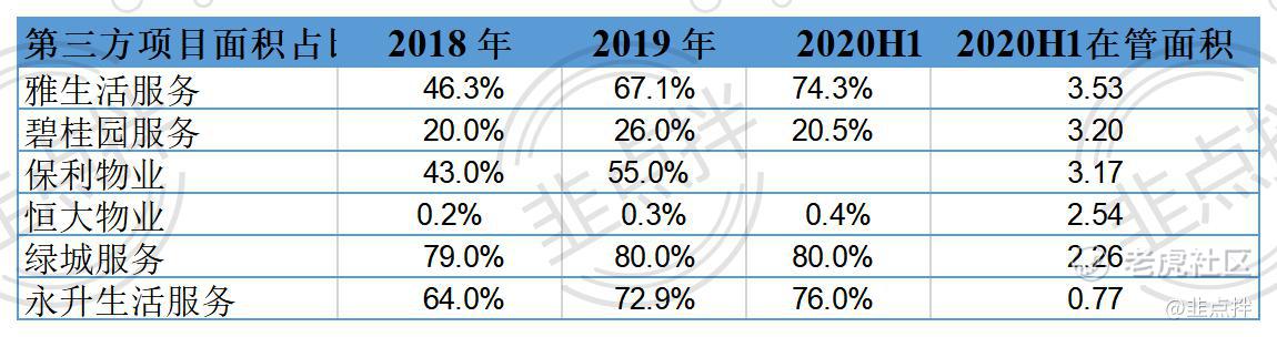 此外,雅⽣活服务2020年上半年第三⽅项⽬占⽐超过80%,主要是其中⼤部分为并购中⺠物业增加的在管⾯积,抬升占⽐。2020年上半年,如果单看新增第三⽅外拓⾯积,排名前三的物管企业分别是绿城服务(3646万平⽶)、碧桂园服务(3498万平⽶)、永升⽣活服务(2828万平⽶)。