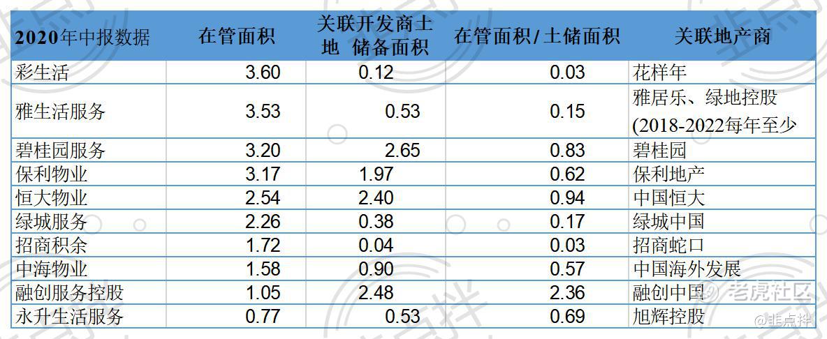 - 关联地产公司公司⼟储⾯积VS物业公司在管⾯积——对于有关联地产开发商⽀持的物管企业来说,如果其地产开发商的⼟储⾯积越⼤,则意味着未来可交付的合约⾯积越多,中⻓期的增⻓潜⼒及确定性越强。