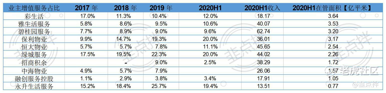 社区增值服务占⽐较⾼的是绿城服务、保利物业、永升⽣活服务。其向养⽼、托幼、家政、⽂化、健康、房屋经纪、快递收发等领域延伸,该项收⼊占⽐⾼,说明业主认可度较⾼。