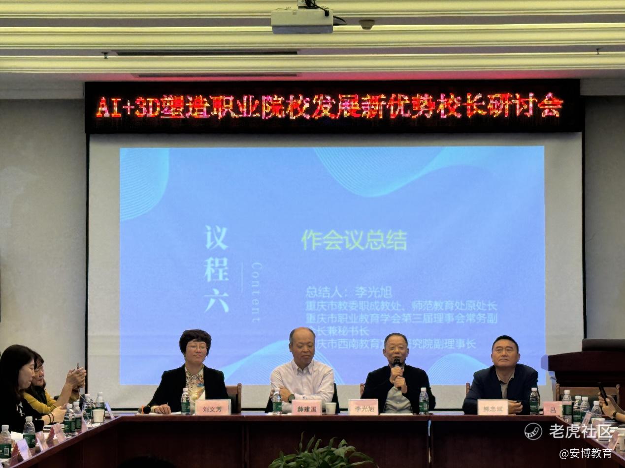 最后,重庆市教委职成教处、师范教育处原处长、重庆市职业教育学会第三届理事会常务副会长兼秘书长李光旭作总结发言。他表示,安博科技在高层次、高技术领域上了一堂高质量的课,既顶天又落地,满足“双高”“五金”等一系列职业院校发展的实际诉求。AI+3D技术,可以对现在的教育教学发生翻天覆地的改变,推动教育发展、重启教育理念、创新教育方法,有利于院系管理的智能化、学生成长的个性化、培养方案的精准化、教学挑战的进阶化、教室智能的迭代化,希望可以通过这次研讨会,让重庆职业教育迈向新的征程。本次研讨会为教育主管部门、行业组织以及企业、院校搭建了良好的交流平台,院校与高科技企业的深度协作也将打开数智未来之门。