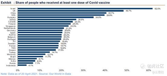 尽管新兴市场疫情失控给全球经济复苏带来阴影,但金融市场永远是前瞻性的:发达国家疫苗接种正积极推进(下图),经济重启进程不会终止,财政和货币将延续宽松,这是全球股市拒绝深度调整的根本原因。