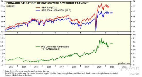 尽管“FAANGM”估值已经比较贵(但仍较A股'便宜'),P/E约40倍,P/S约6倍,但在剔除“FAANGM”后的标普500指数也就约20倍的P/E,2.3倍的P/S。这表明美股泡沫程度并没有'巴菲特指标'看起来的那么夸张。