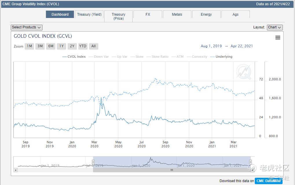 另外,CME还有黄金期权,每个黄金期货合约提供连续20个月份的期权合约,期权持仓一般集中黄金期货主力和次月合约上。针对各类资产的期权工具,CME提供了隐含波动率数据供投资者查询,下图是黄金期权最新隐含波动率走势: