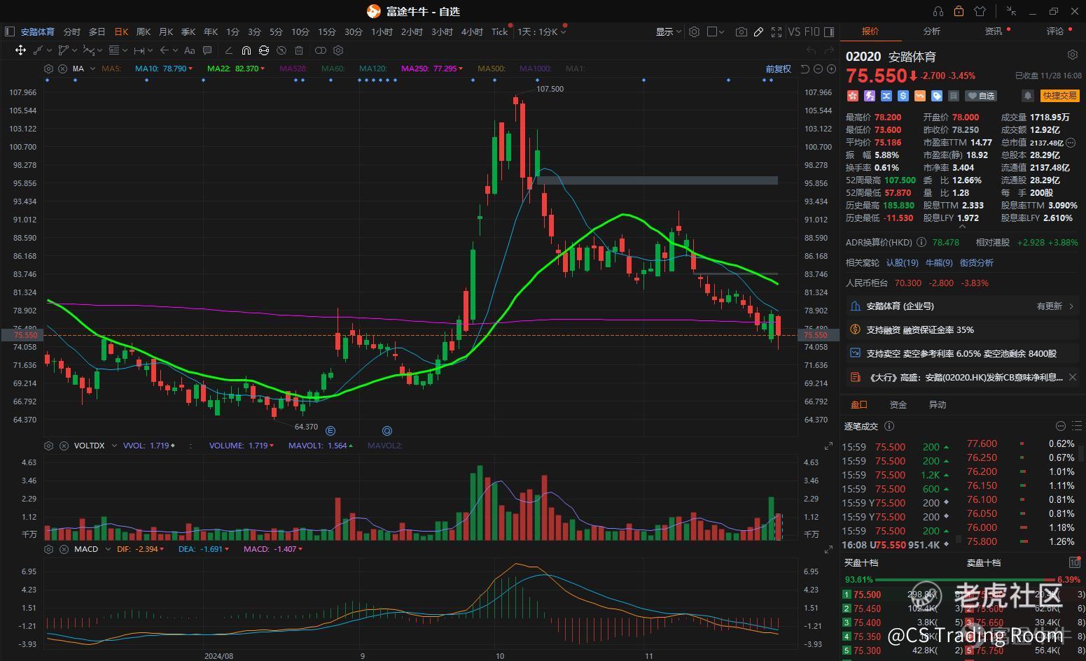 消息方面,11月28日,中华全国商业信息中心发布2024年9月运动服品牌销售分析。数据显示,2024年9月份全国重点大型零售企业(以百货商场为主)服装类零售额同比下降11.58%,服装类零售量同比下降12.30%,运动服零售量同比下降10.56%。