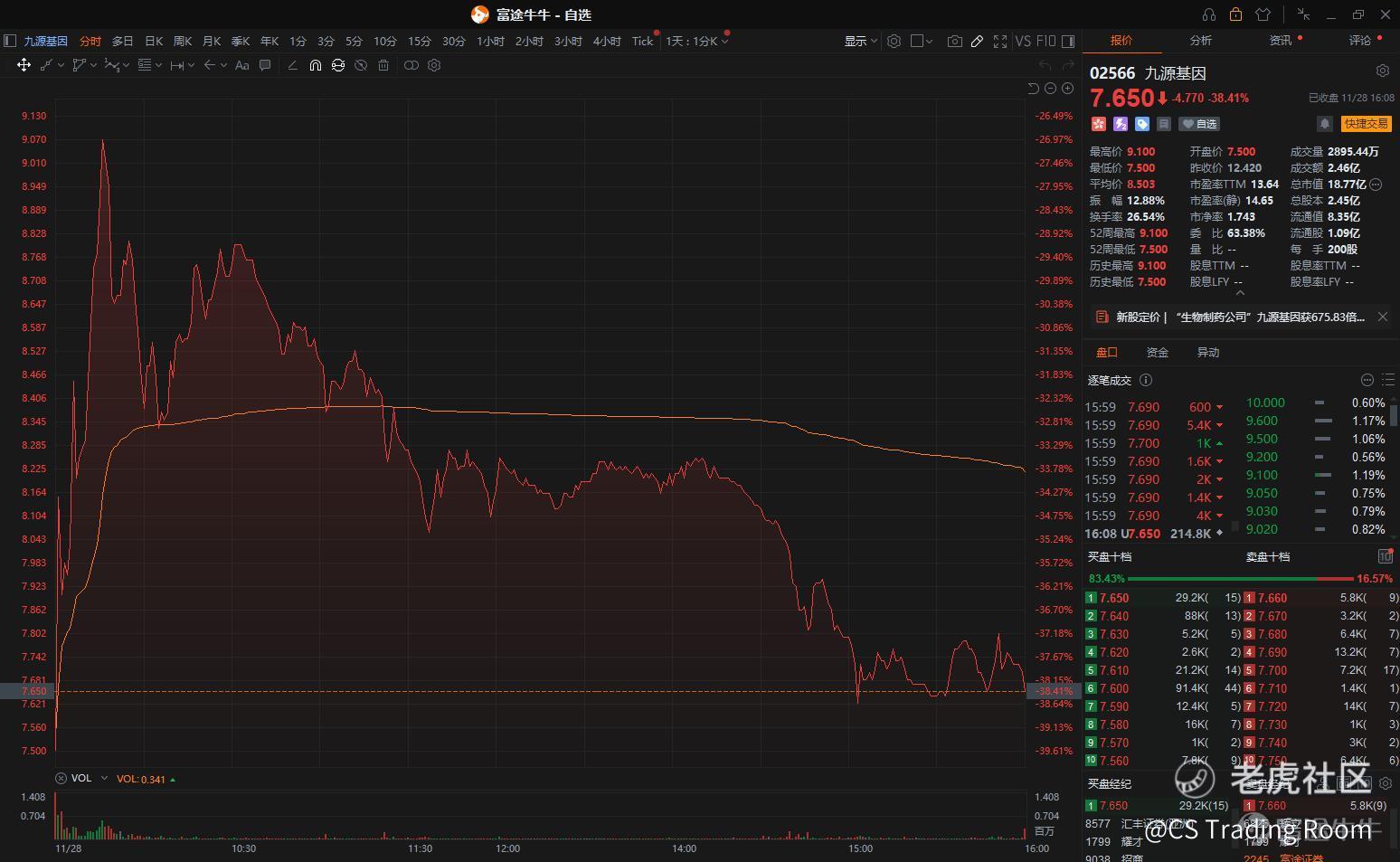 生物技术股多数下跌, $九源基因 (02566.HK)$ 跌38.41%, $宜明昂科-B (01541.HK)$ 跌14.12%, $云顶新耀-B (01952.HK)$ 跌12.36%, $巨子生物 (02367.HK)$ 跌6.85%, $康方生物 (09926.HK)$ 跌5.22%, $药明生物 (02269.HK)$ 跌0.95%, $百济神州 (06160.HK)$ 涨0.25%。