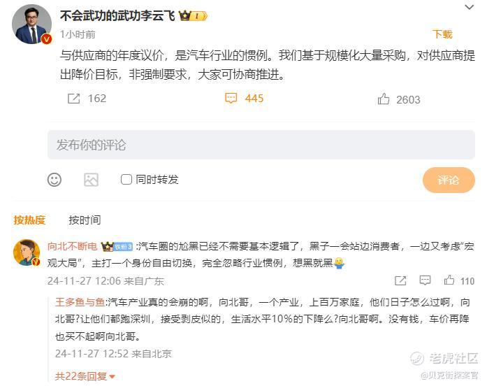和华为合作车型涨价不同的是,如今整车业价格战愈演愈烈,2024年11月27日,比亚迪再次因要求供应商降价10%冲上热搜,公司品牌公关处总经理李云飞下场回应称,“与供应商的年度议价,是汽车行业的惯例。我们基于规模化大量采购,对供应商提出降价目标,非强制要求,大家可协商推进。”