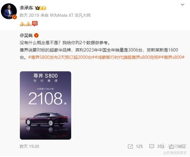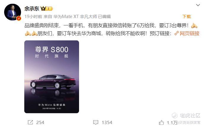 发布会结束后,余承东在社交平台发文称,“有朋友直接微信转账了6万给我,要订3台尊界!”并附预定链接。